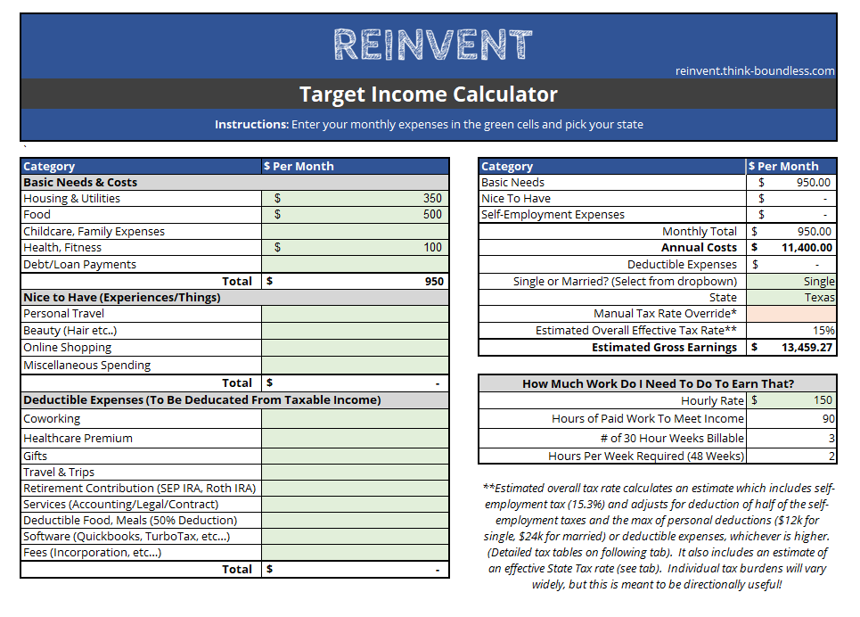This calculator takes into account US self-employment taxes, state taxes, and normal deductions and then determines what income you need to make based on your spending habits.